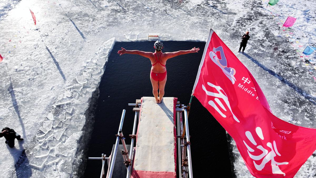 A winter swimmer jumps into the icy Songhua River from a 4-meter-high diving platform in Harbin, Heilongjiang province. [Photo by Yang Wei for chinadaily.com.cn]