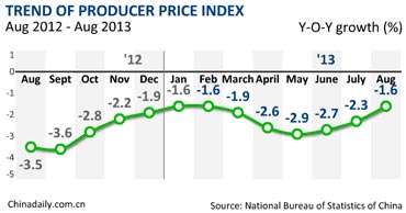 China's producer price index fell 1.6 percent in August from the same month last year, the National Bureau of Statistics said Monday.