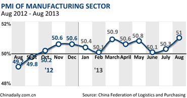China's manufacturing sector ended a three-month decline in August with the PMI rising to 50.1 from an 11-month low of 47.7 in July, according to HSBC Holdings on Monday.