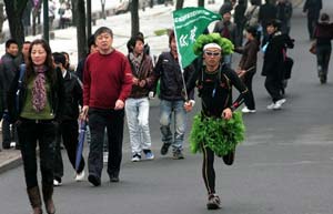 Chen Jun, a long-distance runner who shaved his head, wearing a green leafy hat and skirt, runs on the Bai Causeway (Bai Di) of West Lake in Hangzhou, East China, on Nov 16.