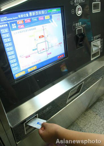 A passenger buys an electronic ticket to ride the subway at a station in Beijing June 9, 2008. With the use of the AFC system, paper tickets, which had been in use for 38 years, faded out from the subway system on Monday. [asianewsphoto]