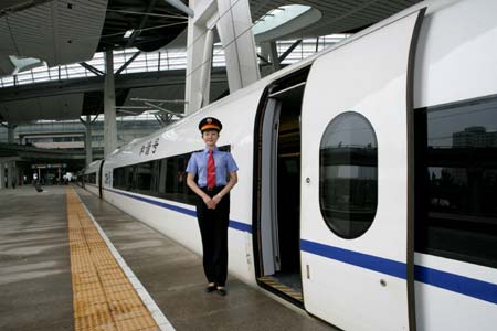 About 100 km of the line, or 86 percent, was built on an elevated alignment because of the area's alluvial soil, which was sensitive to ground settlement. The new service would cut the 120-km journey from the current 70 minutes to about 30 minutes, according to Wang. There are five stations along the line: the cavernous new Beijing South Railway Station, Yizhuang, Yongle, Wuqing and Tianjin. The train is classifed by the MOR as C-category, with C standing for Chengji, meaning intercity. There will be 10 trains of eight cars that can seat about 600 passengers. These sleek trains, with aircraft-like cabins, swivel seats, spacious interiors and rooftop solar panels, were built by the Sifang Locomotive and Rolling Stock Company. Called the CRH-3 (China Railway High-speed), these were China's first self-designed and self-manufactured passenger trains. The MOR had said about 26 million passengers traveled between the two cities every year, and this new line was forecast to raise the figure to 32 million in 2008. |