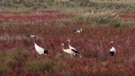The wetlands of the Yellow River estuary in Dongying, Shandong province, witness the Yellow River flowing into the Bohai Sea. Birds, including red-crowned cranes, oriental white storks, and egrets, roam freely in serene harmony.