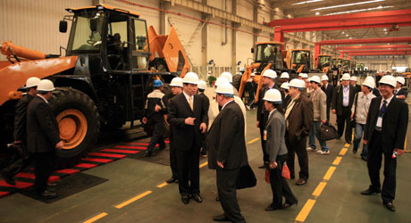 福田雷沃重工董事長王金富在給外國客商介紹出口機械生產(chǎn)情況
