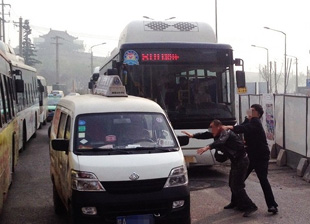 西安一公交司機和貨運司機當街廝打 乘客無語了