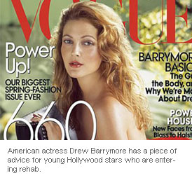 American actress Drew Barrymore has a piece of advice for young Hollywood stars who are entering rehab.