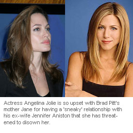 Actress Angelina Jolie is so upset with Brad Pitt's mother Jane for having a 'sneaky' relationship with his ex-wife Jennifer Aniston that she has threatened to disown her.
