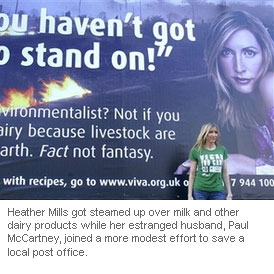 Heather Mills got steamed up over milk and other dairy products while her estranged husband, Paul McCartney, joined a more modest effort to save a local post office.