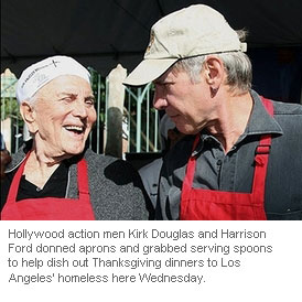 Hollywood action men Kirk Douglas and Harrison Ford donned aprons and grabbed serving spoons to help dish out Thanksgiving dinners to Los Angeles' homeless here Wednesday.