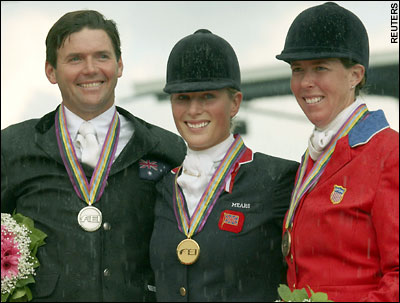 8月27日,在德國亞琛舉辦的世界馬術比賽上贏得冠軍獎牌后,扎拉和其他選手留下了一張合影。照片中的這位皇室眼中的“叛逆者”難得露出了略帶羞澀的笑容。