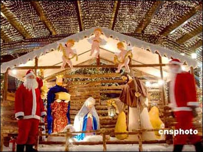 北京盈科大廈前搭建的耶穌在馬槽里誕生的布景,成為北京街頭獨特景致。