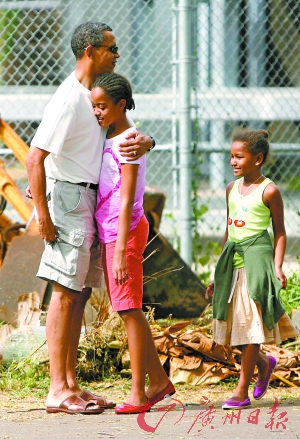 2008年12月31日,奧巴馬在夏威夷度假時與兩個女兒在一起。