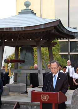 9月21日,在紐約聯(lián)合國(guó)總部花園的和平鐘前,聯(lián)合國(guó)秘書長(zhǎng)潘基文為戰(zhàn)爭(zhēng)中的死難者默哀。