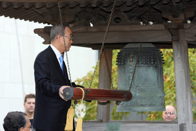 9月21日,聯(lián)合國(guó)秘書長(zhǎng)潘基文在紐約聯(lián)合國(guó)總部敲響和平鐘,以紀(jì)念第26個(gè)“國(guó)際和平日”。