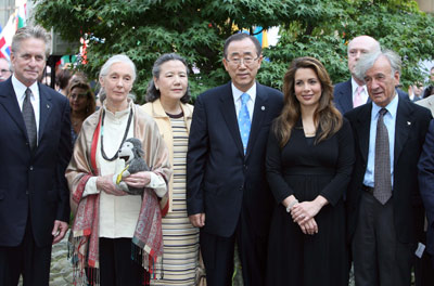 9月21日,在紐約聯(lián)合國(guó)總部花園舉行的鳴和平鐘儀式上,聯(lián)合國(guó)秘書長(zhǎng)潘基文(前排右三)、潘基文夫人潘淳澤(前排左三)與聯(lián)合國(guó)和平使者邁克爾·道格拉斯(前排左一)、簡(jiǎn)·高達(dá)(前排左二)、哈亞公主(前排右二)、埃利·韋塞爾合影。