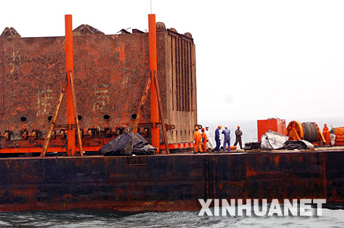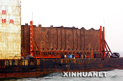 12月23日,廣州打撈局的工作人員在行駛的駁輪上查看裝有“南海一號”的沉箱。新華社記者周文杰攝