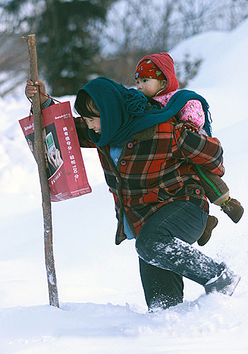 雪深沒膝,歸途迢迢。勇敢的母親面前沒有退路,樂觀的母親心里只有微笑。