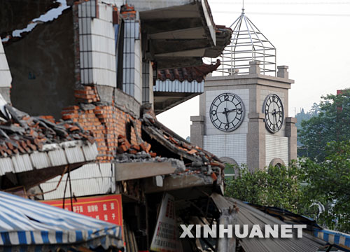 在四川省綿竹市漢旺鎮(zhèn)拍攝的鐘樓,鐘表指針定格在14時28分(5月19日攝)。國務院發(fā)布公告,決定5月19日至21日為全國哀悼日。5月19日14時28分起,全國人民默哀3分鐘,屆時汽車、火車、艦船鳴笛,防空警報鳴響。新華社發(fā)