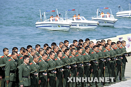 5月19日14時28分,擔負奧運會帆船比賽海上安保任務的青島公安邊防支隊官兵在奧帆中心為地震遇難者鳴笛默哀。