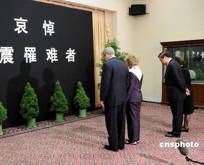 美國總統(tǒng)布什5月20號(hào)來到中國駐美大使館悼念在四川地震中的遇難者,并在留言薄上表示哀悼。