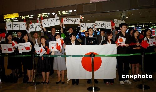 5月21日上午,數(shù)十位在日華人華僑自發(fā)來(lái)到成田機(jī)場(chǎng),歡迎從四川地震災(zāi)區(qū)歸來(lái)的日本國(guó)際緊急救援隊(duì)。他們手持中日兩國(guó)國(guó)旗和書(shū)有“中國(guó)人感謝日本”、“救援隊(duì)的諸位辛苦了”的橫幅,向支援中國(guó)抗震救災(zāi)的救援隊(duì)隊(duì)員表示感謝。中新社發(fā) 朱沿華 攝