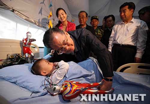 5月23日,中共中央政治局常委、國務院總理、國務院抗震救災總指揮部總指揮溫家寶前往四川綿陽404醫院看望受傷群眾。這是溫家寶在監護室看望在地震中受傷的小朋友郎錚。新華社記者姚大偉攝