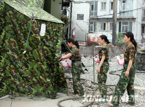 女兵排隊走進野戰多功能車洗漱(6月5日攝)。 新華社記者 張燕輝攝