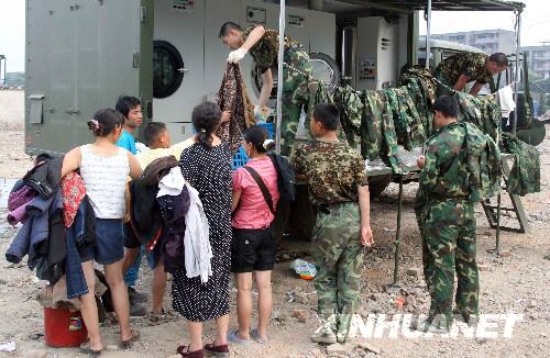 部隊官兵用野戰洗滌車為受災群眾免費洗衣物(6月5日攝)。 新華社記者 張燕輝 攝
