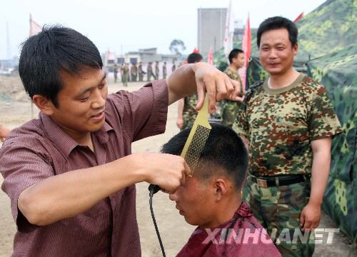 志愿者在為部隊官兵理發(6月5日攝)。 新華社記者 張燕輝攝