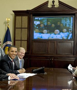 視頻連線一開始,奧巴馬的開場白就把在畫面上出現的宇航員們逗樂了:“嘿,我聽說你們正在以每小時1.7萬英里的速度繞地球公轉,我們在地面的人很高興你們可以不用拿著有線電話機跟我們聊天”。空間站指令長邁克·芬克隨后向奧巴馬介紹了國際空間站的情況,稱它每90分鐘繞地球一圈,宇航員每24小時看到16次日出日落。