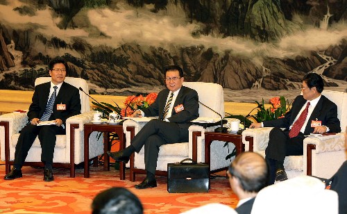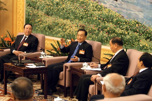 3月8日,中共中央政治局常委、國務院總理溫家寶參加十屆全國人大四次會議新疆代表團審議,聽取代表們的意見。