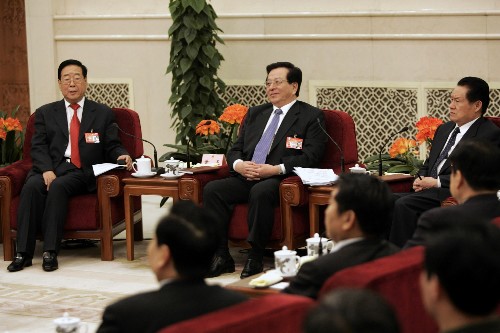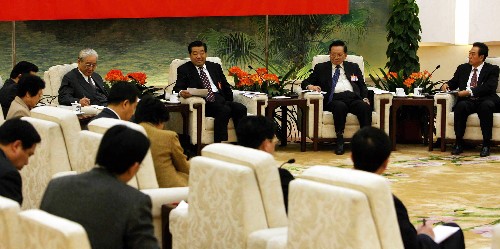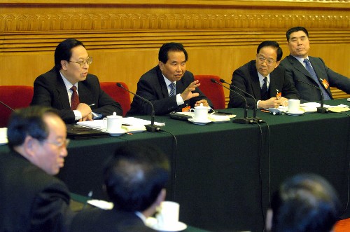 3月8日,中共中央政治局常委、全國政協主席賈慶林參加十屆全國人大四次會議臺灣代表團審議。 新華社記者劉衛兵攝