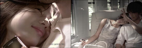 全智賢則在化妝品粉餅的廣告中展現了似有若無的化妝效果。為體現化妝品的性能,全智賢繼第一個廣告之后,在第二個廣告片中也同樣向觀眾展示光彩照人的“素顏”微笑。在男友懷里偷偷補妝的她,拋出狐貍般勾魂的眼神。
