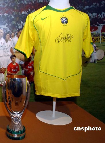 為配合在德國舉行的世界杯,香港康文署與英國國家足球博物館合作,21日起在歷史博物館展出世界杯文物、著名足球隊(duì)和球星的歷史物品、圖片和互動游戲等。圖為超級球星羅納爾迪尼奧的親筆簽名球衣。(中新社發(fā)