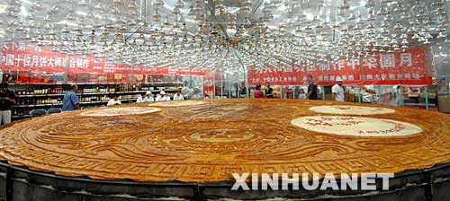 圖為新制作完成的大月餅(2007年8月21日攝) 8月21日,在沈陽(yáng)揭幕的首屆中國(guó)烘焙食品節(jié)上,10位月餅大師聯(lián)手現(xiàn)場(chǎng)制作的直徑大約8米的超級(jí)大月餅亮相。對(duì)于這樣的商業(yè)行為,有人認(rèn)為是“商業(yè)創(chuàng)意”,也有人責(zé)問(wèn)“工程浩大”、“徒費(fèi)錢(qián)糧”,爭(zhēng)議之聲不斷。據(jù)介紹,“超級(jí)大月餅”皮和餡的重量至少有10噸。新華社記者 李鋼 攝