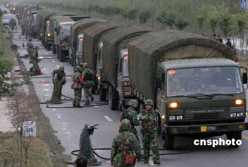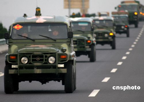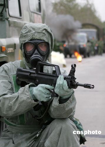 參演部隊長途奔襲。10月28日,鐵拳-2007機步師實兵檢驗性演習部隊在機動途中展開防持久毒劑襲擊,化學偵察,道路消毒,裝備消毒,人員消毒等科目演練。中新社發曾憲平 攝