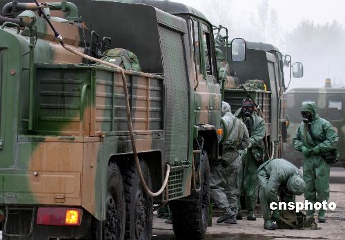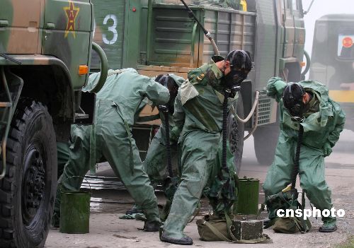 展開防化學武器襲擊科目訓練。10月28日,鐵拳-2007機步師實兵檢驗性演習部隊在機動途中展開防持久毒劑襲擊,化學偵察,道路消毒,裝備消毒,人員消毒等科目演練。中新社發曾憲平 攝