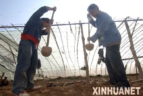 安塞縣沿河灣鎮侯溝門村兩位農民在修建蔬菜大棚(11月4日攝)。新華社記者李曉果 攝