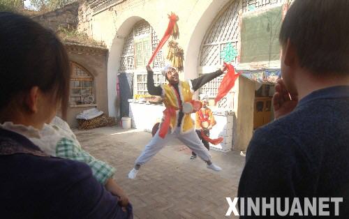 安塞縣馬家溝的陳丕亮在自家窯洞前為游客表演腰鼓(11月4日攝)。 新華社記者李曉果 攝