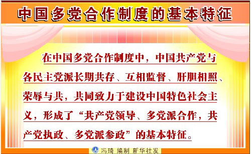 中國多黨合作制度中包括中國共產黨和八個民主黨派。八個民主黨派是中國國民黨革命委員會、中國民主同盟、中國民主建國會、中國民主促進會、中國農工民主黨、中國致公黨、九三學社、臺灣民主自治同盟。中國人民政治協商會議(以下簡稱人民政協)是中國共產黨領導的多黨合作和政治協商的重要機構。在中國多黨合作制度中,中國共產黨與各民主黨派長期共存、互相監督、肝膽相照、榮辱與共,共同致力于建設中國特色社會主義,形成了“共產黨領導、多黨派合作,共產黨執政、多黨派參政”的基本特征。中國多黨合作制度在中國的政治和社會生活中顯示出獨特的政治優勢和強大的生命力,發揮了不可替代的重大作用。