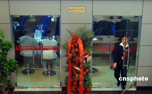 4月11日,北京赴美簽證服務大廳新址在朝陽區建外街秀水大廈西側落成并正式對外開放,服務大廳設立候簽、咨詢、照相、翻譯、復印、銀行等綜合服務項目,并為特殊需要的人員準備了VIP包間服務。圖為翻譯服務大廳。