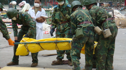 官兵們將挖掘出來(lái)的學(xué)生遺體抬走