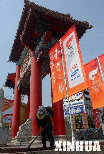 這是工人在火炬傳遞的起點――位于曼谷唐人街的“中國門”進行準備工作(4月17日攝)。新華社記者 公磊 攝
