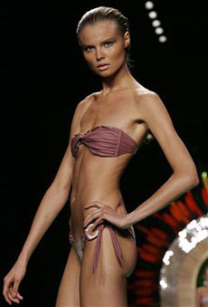 苗條并不是T型臺的永恒標準。西班牙馬德里政府近日發出禁令,禁止過于纖瘦的模特在本月底舉行的馬德里時裝周上走秀表演,原因是擔心她們給年輕的女孩傳遞“錯誤的信息”。時裝周組織者認為,一些女性觀眾會羨慕那些瘦骨嶙峋的模特而盲目減肥,導致飲食紊亂。這是時裝界首次對模特的體重進行如此要求,馬德里政府希望此舉能鼓勵時裝秀展現模特們美麗健康的形象,而不是消瘦頹廢的“乞丐”或“吸毒者”。 |