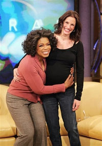 Talk-show host Oprah Winfrey hugs actress Julia Roberts, pregnant with her twins, on the set of 'The Oprah Winfrey Show' during taping in this Oct. 6, 2004, file photo.