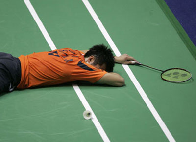 | China's Lin Dan falls as he tries to retrieves a shot from South Korea's Park Sung Hwan in the Malaysian Open badminton tournament in Kuala Lumpur January 18, 2007. Lin was toppled by the South Korean 21-14, 21-17. [Reuters] |
