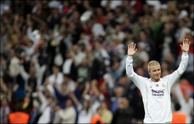 | Real Madrid's David Beckham waves to fans after his side beat Deportivo la Coruna on 26 May 2006. London's Evening Standard has reported that officials in Britain are wrangling over whether the former England football captain should be given a knighthood since he is moving to Los Angeles this summer.[AFP] |