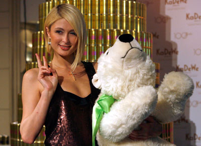 US socialite Paris Hilton poses for the media with a cuddly toy of Berlin's polar bear cub Knut, at the KaDeWe department store December 12, 2007. (Agencies)
