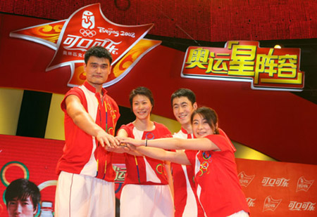 Beijing 2008 Olympics sponsor Coca Cola holds a news conference to promote upcoming Olympic torchbearers selection event, which Chinese NBA star Yao Ming(L), "diving queen" Guo Jingjing(R), top table tennis player Wang Liqin,second right,and other well-known Chinese athletes attend on July 3rd, 2007 in Beijing.[sina.com]