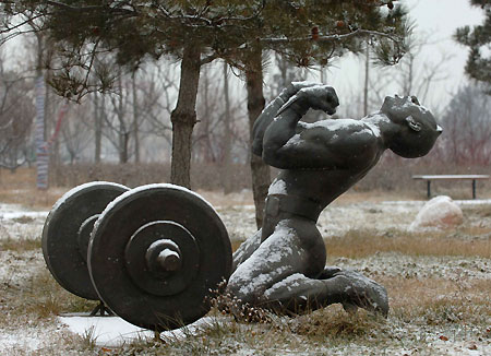 A layer of snow covers a copper-made statue of a weight-lifter celebrating victory in Qinhuangdao's Olympic Park, December 28, 2007. Qinhuangdao, in North China's Hebei Province, is a co-host city for next year's Games. [Xinhua]